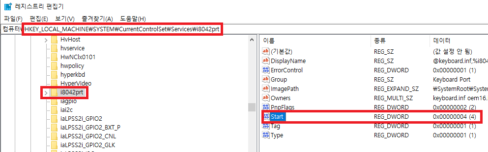 * 경로 : HKEY_LOCAL_MACHINE\SYSTEM\CurrentControlSet\Services\i8042prt