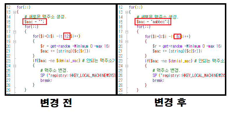 ★ 윈도우 파워쉘을 활용하여 무선랜카드의 맥주소를 변경합니다. 해당 스크립트는 아래의 TXT 파일을 통해서 얻을 수 있습니다. |